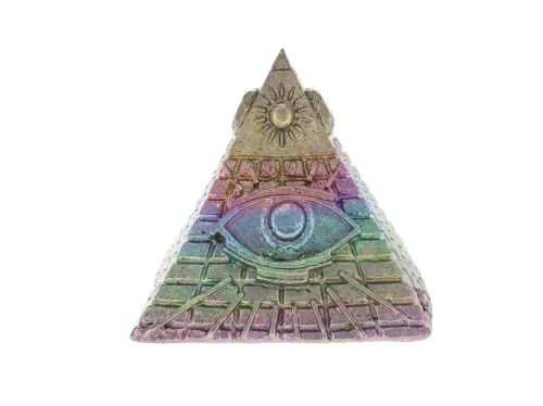 This Bismuth Pyramid displays a beautiful rainbow of iridescent metallic Colors and features the All-Seeing Eye, a symbol of protection and good luck.