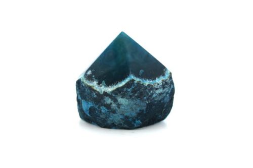 This part polished, free-standing point shows the dyed Teal Agate both in its rough and polished form.