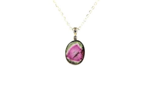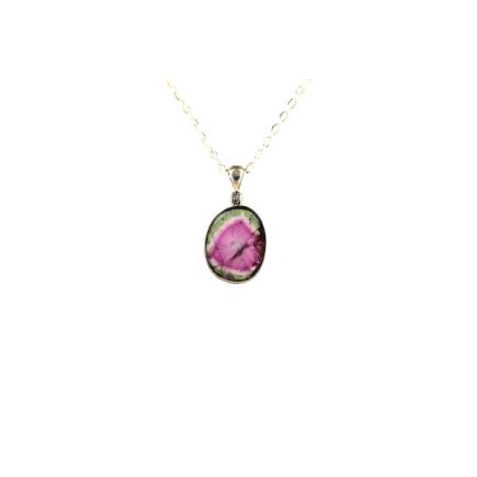 This pretty open back pendant features a Watermelon Tourmaline slice with natural shades of light green and pink inclusions set in sterling silver.