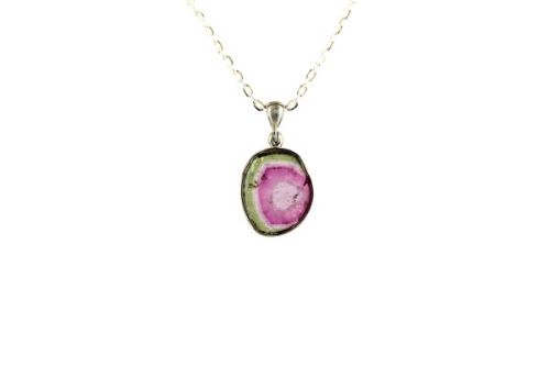 This pretty open back pendant features a Watermelon Tourmaline slice with natural shades of light green and pink inclusions set in sterling silver.