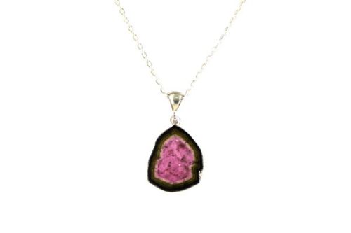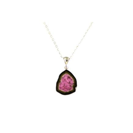 This pretty open back pendant features a Watermelon Tourmaline slice with natural shades of light green and pink inclusions set in sterling silver.