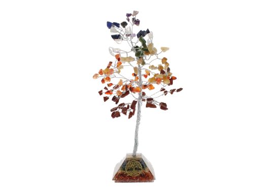 This gemtree is planted on an orgone pyramid base with The Tree of Life symbol and is filled with the same natural crystals, which is said to help cleanse, purify and balance energy.
